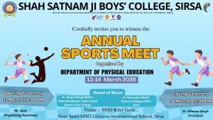 from March 13 to 14, 2026 in the Shah Satnam Ji Khel Gaon playground, under the supervision of Mr. Amit, Assistant Professor (HOD), Department of Physical Education. All the students of the college are encouraged to participate actively in various track and field events, games, and competitions.